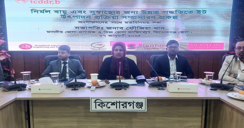 কিশোরগঞ্জে ‘নির্মূল বায়ু এবং সুস্বাস্থ্যের জন্য উন্নত পদ্ধতিতে ইট উৎপাদন প্রক্রিয়া সম্প্রসারণ প্রকল্প’ বিষয়ে অংশীজনদের সাথে মতবিনিময় সভা অনুষ্ঠিত হয়েছে। আইসিডিডিআরবির আয়োজনে গতকাল মঙ্গলবার জেলা প্রশাসন সম্মেলন কক্ষে এই সভা অনুষ্ঠিত হয়। এতে সভাপতিত্ব করেন কিশোরগঞ্জের জেলা প্রশাসক ফৌজিয়া খান। আয়োজন সহযোগিতায় ছিল বুয়েট, গ্রিনটেক নলেজ সলিউশন ও স্ট্যানফোর্ড ইউনিভার্সিটি।
